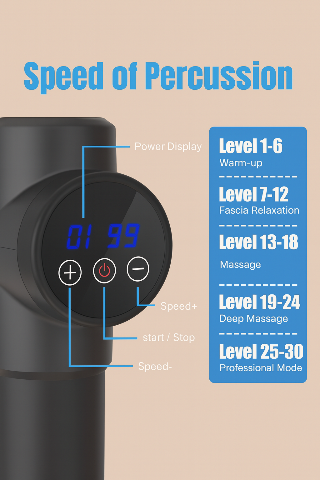💪 30 Speed Levels — From gentle warm-up to pro-level deep tissue recovery.